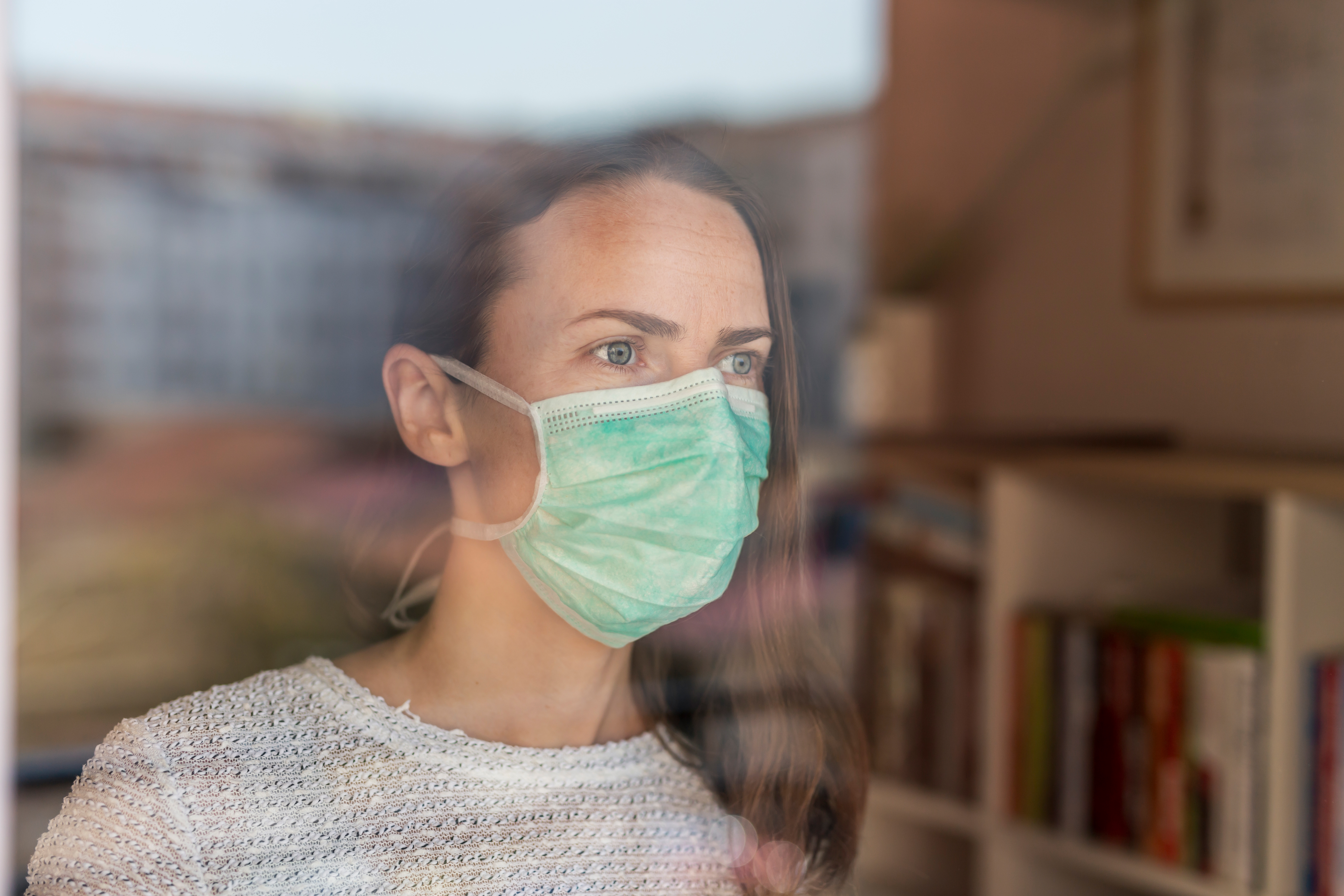 Retrato de una mujer de pie dentro de su departamento, con mascarilla de protección de la cara, en cuarentena durante el brote de coronavirus