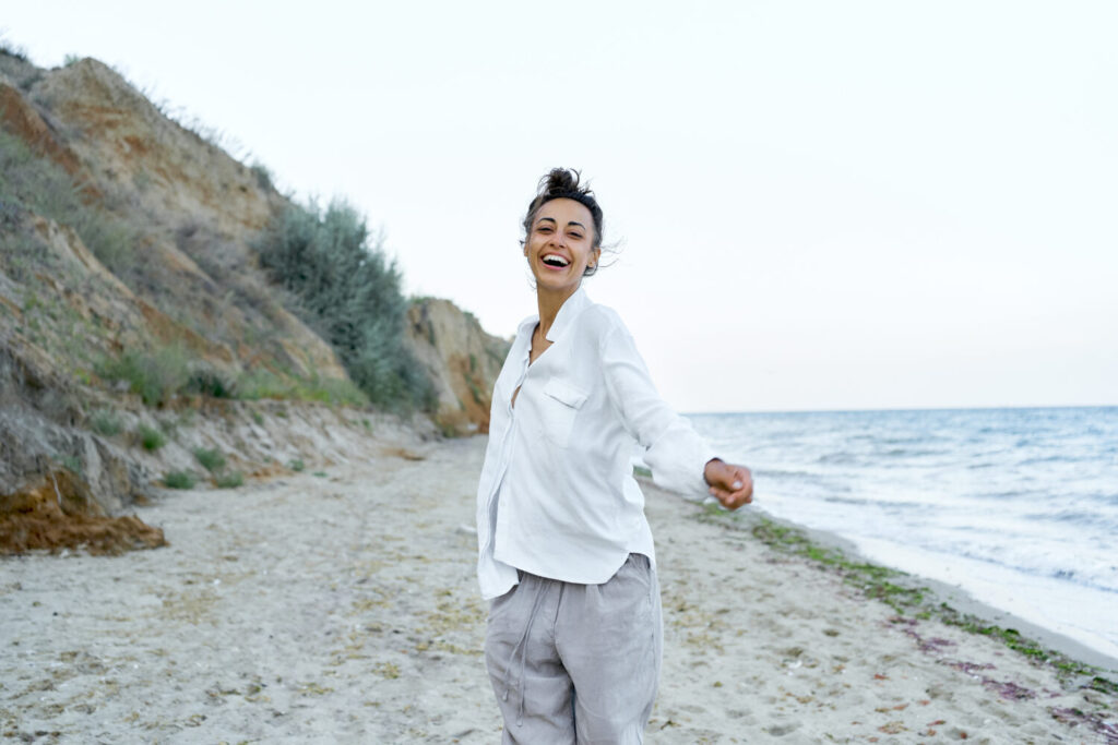 retrato emocional mujer norteamericana en la playa salvaje risas y sonrisas espontáneas, espíritu alto y concepto de bienestar