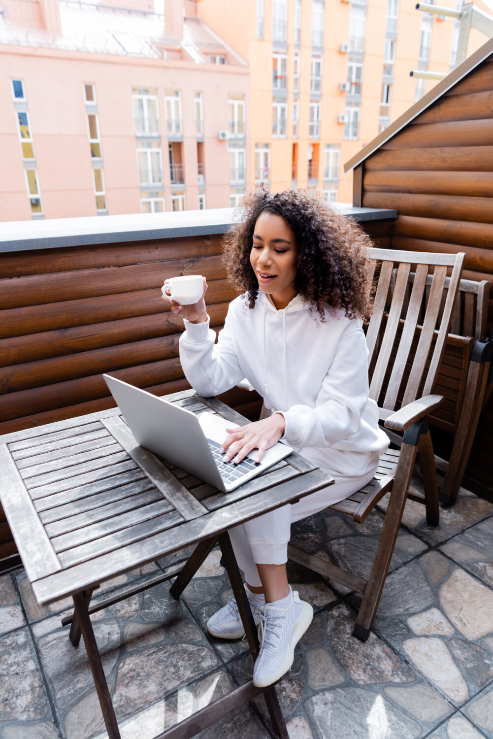rily african freelancer sosteniendo taza con café y trabajando fuera