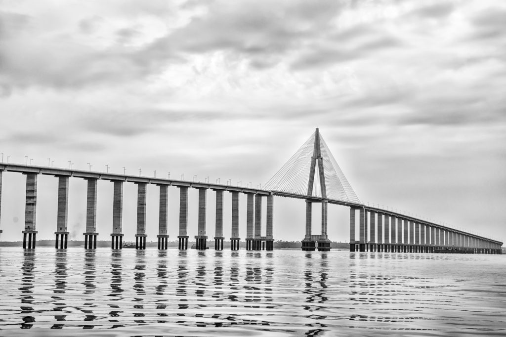 Road passage over water on cloudy sky. Bridge over sea in manaus, Brazil
