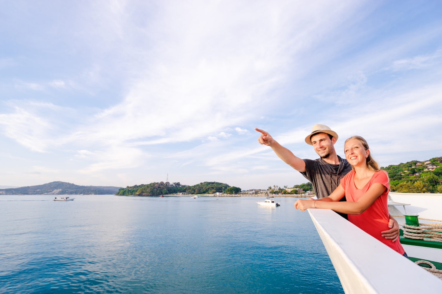 Romantic vacation. Young loving couple enjoying view on cruise ship deck. Sailing the sea.