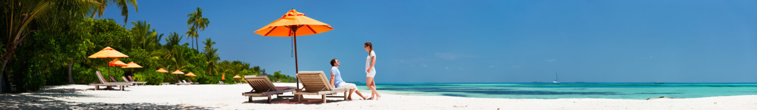 Romántica pareja en una playa tropical durante las vacaciones de luna de miel, super amplio panorama perfecto para banderas