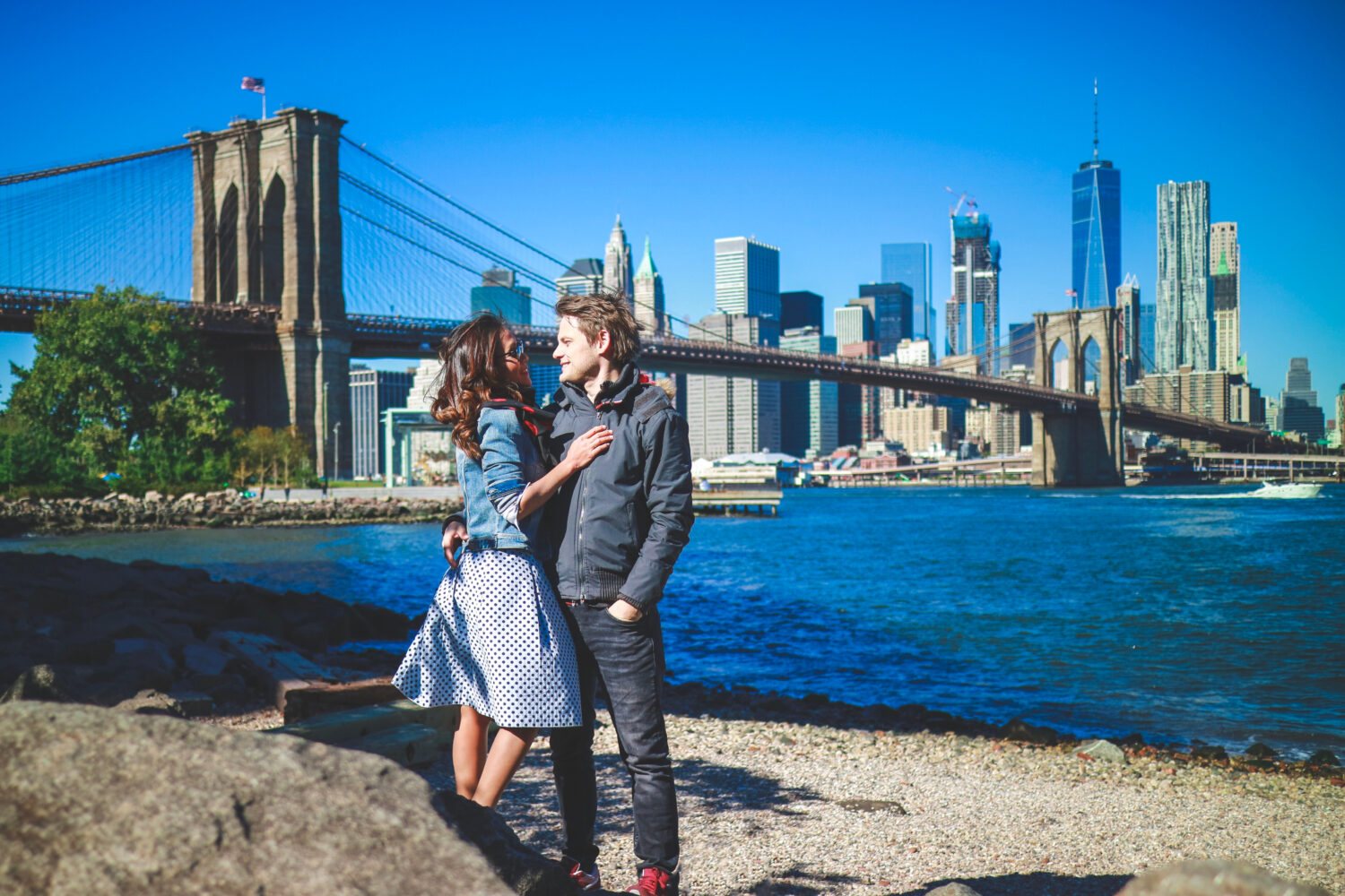 Romántica pareja Mujer y hombre con el hermoso puente de Brooklyn y el fondo de la ciudad de Manhattan. Feliz viaje familiar a Nueva York, EE.UU.