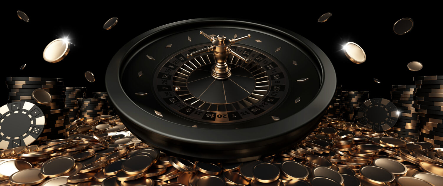 Rueda De Ruleta, Chips Y Monedas De Casino, Negro Moderno Y Dorado Aislado En El Fondo Negro. Concepto de juegos de azar de casino – Ilustración 3D