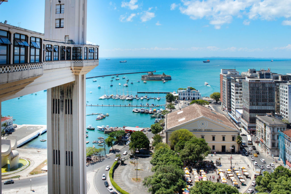 salvador brazil city skyline view with mercado modelo and bay