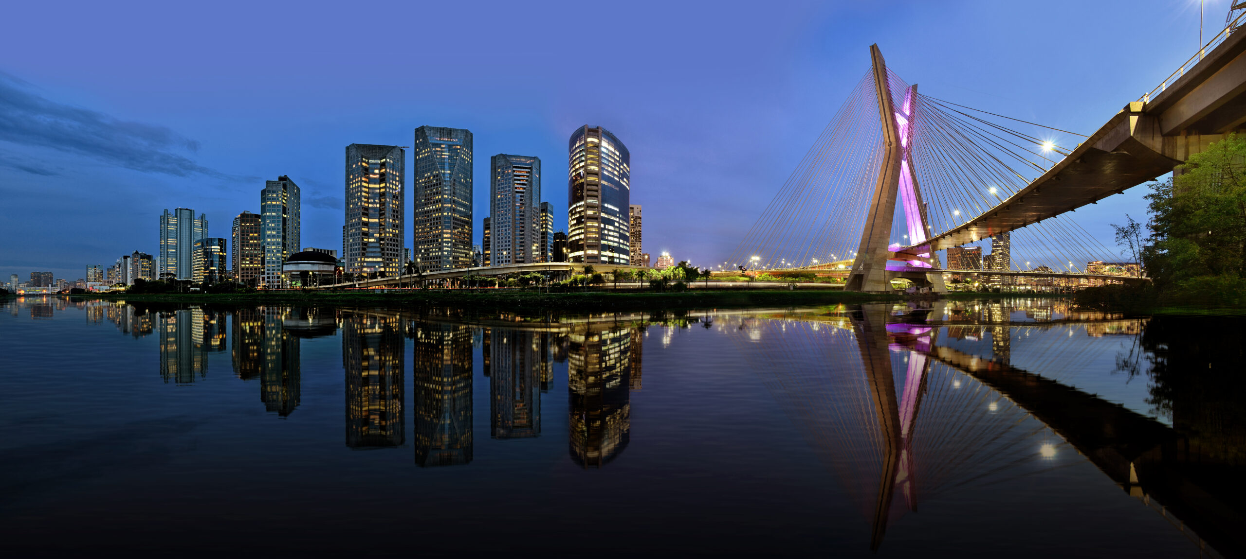 Sao Paulo skyline reflected on Pinheiros River at blue hour