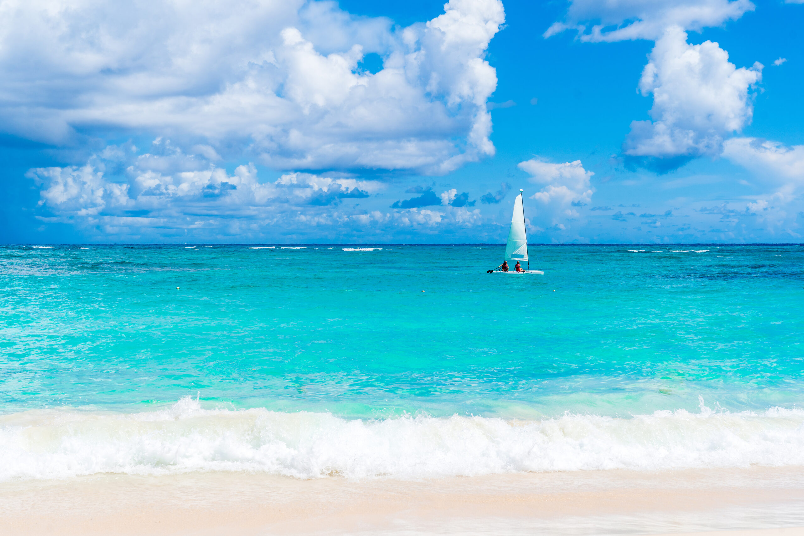 Scenic Beach with Turquoise Waters and a Sailboat in Punta Cana, Dominican Republic. ID: 77600 Peaceful pristine turquoise waters of Dominican Republic.