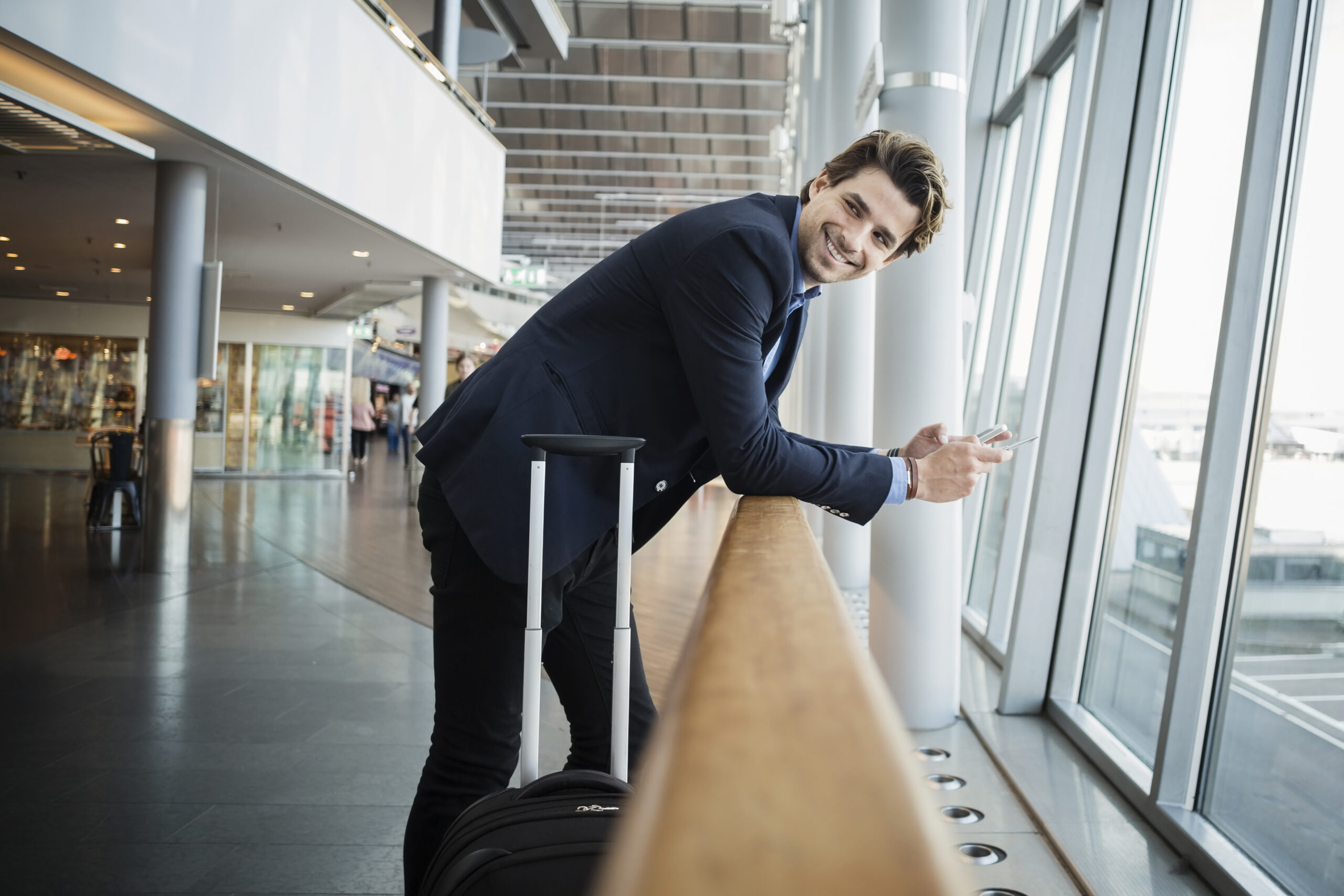 Side view of happy businessman leaning on railing at airport