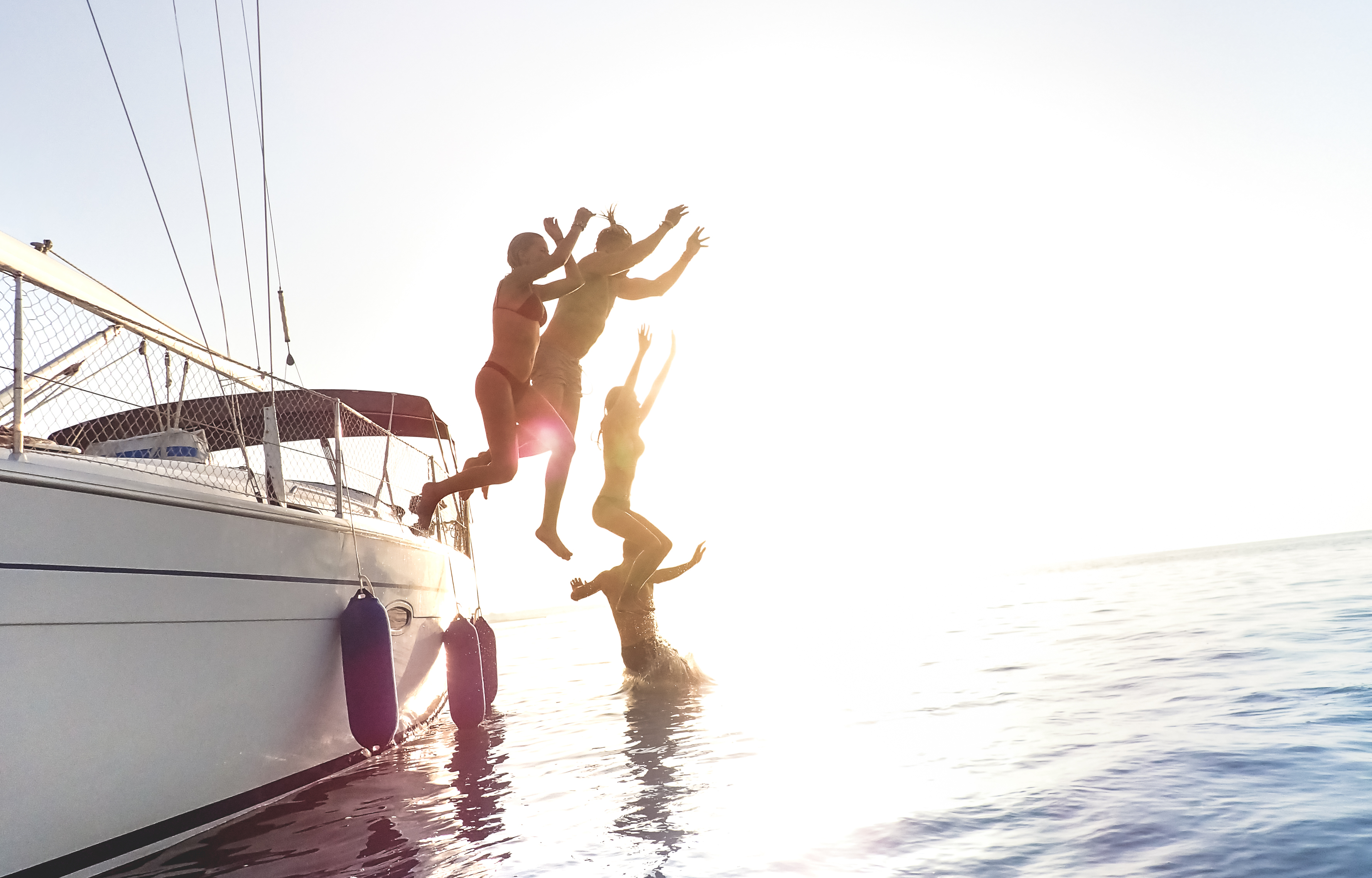 side view of young millennial friends jumping from sailboat on