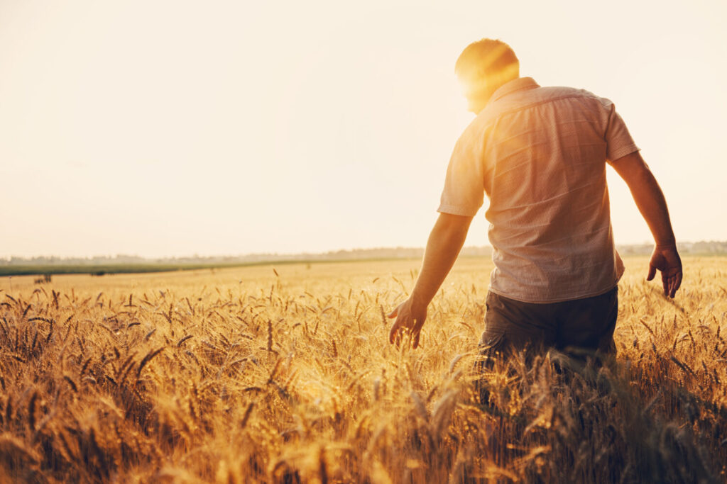 silhouette de hombre agronomo granjero en campo de trigo dorado