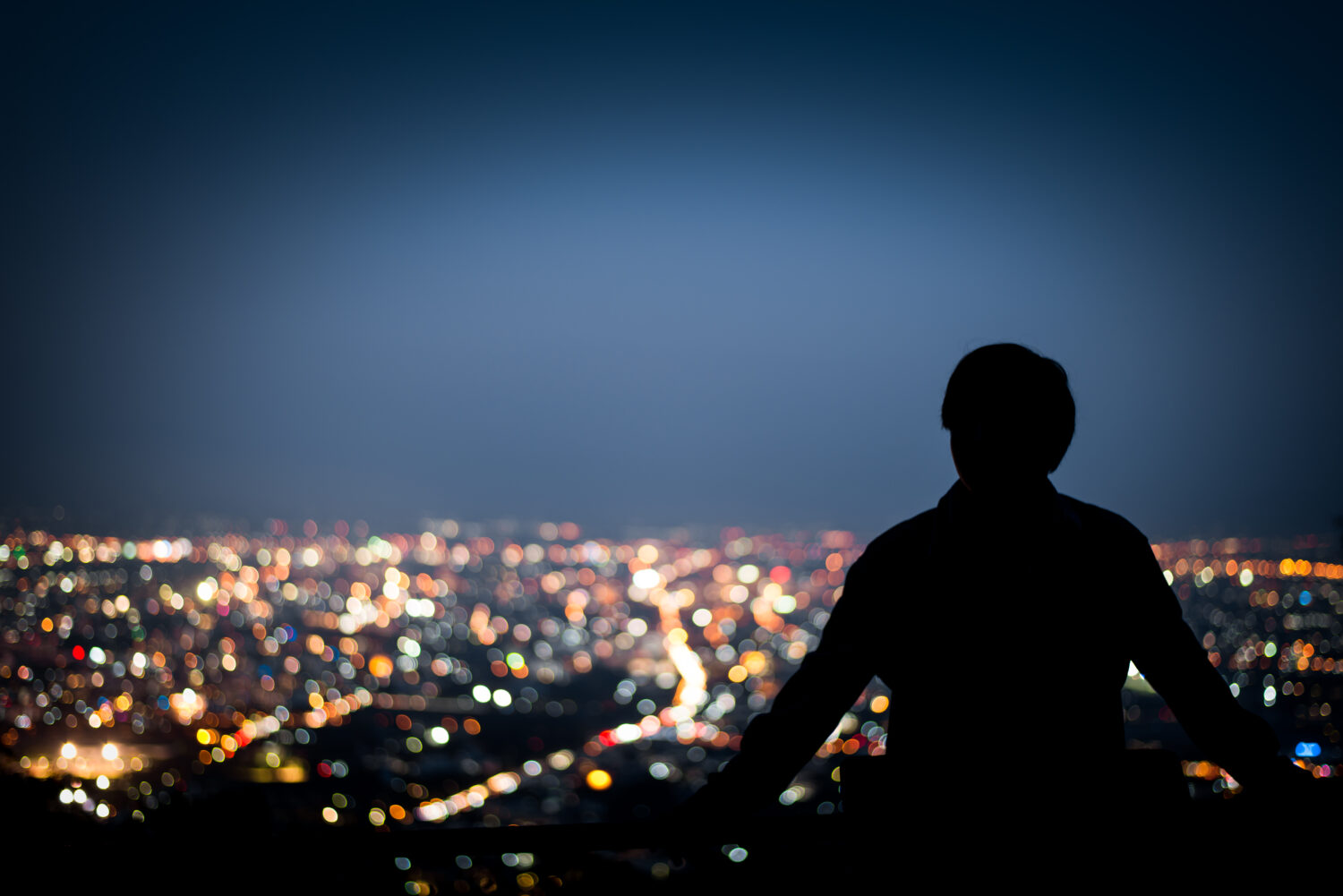 Silhouette de hombre mirando por encima de la ciudad en la noche