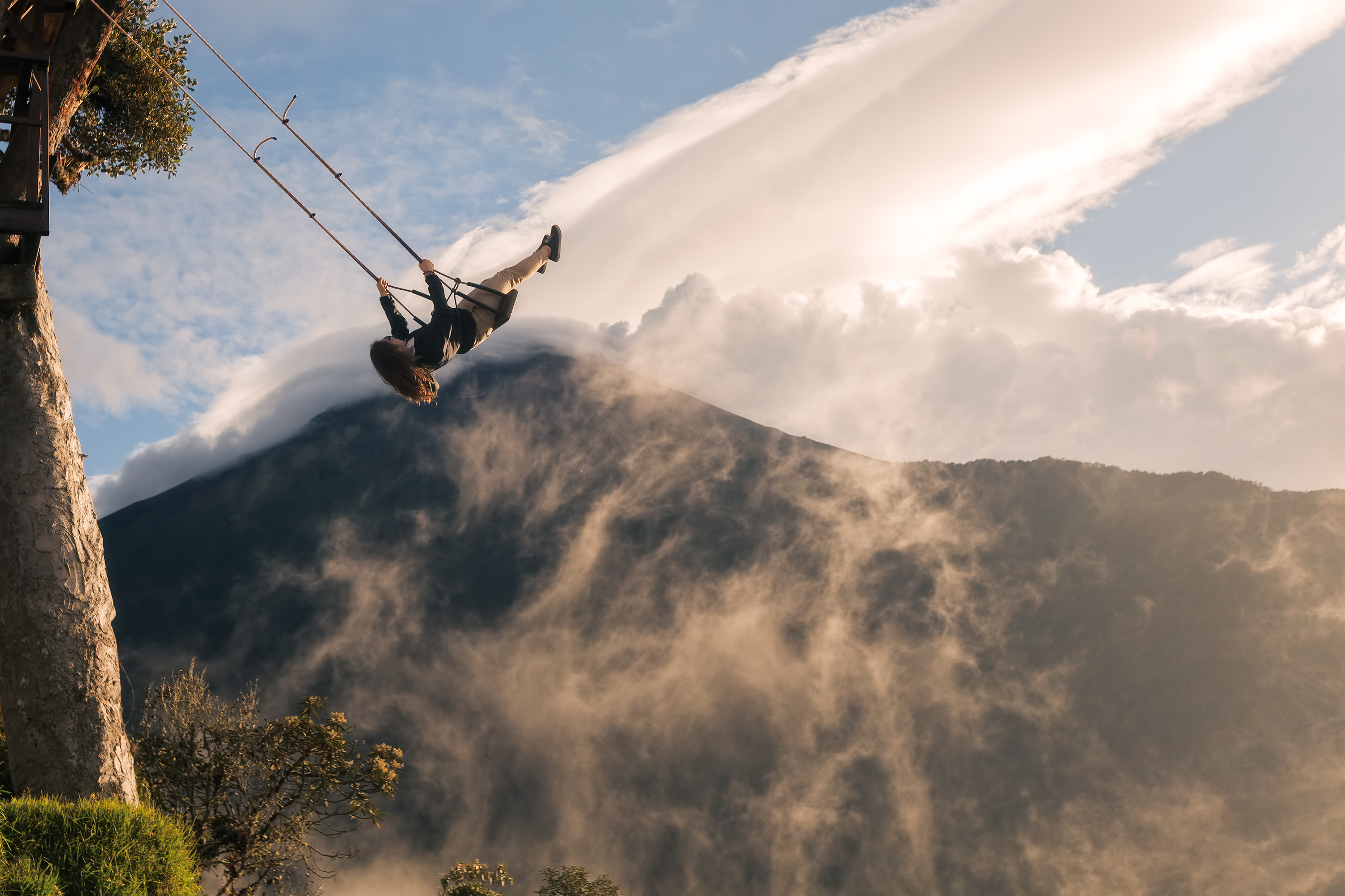 Silhouette Of A Happy Young Teenager Girl Swinging On A Swing Above The Andes Mountains, Tungurahua Volcano In The Background