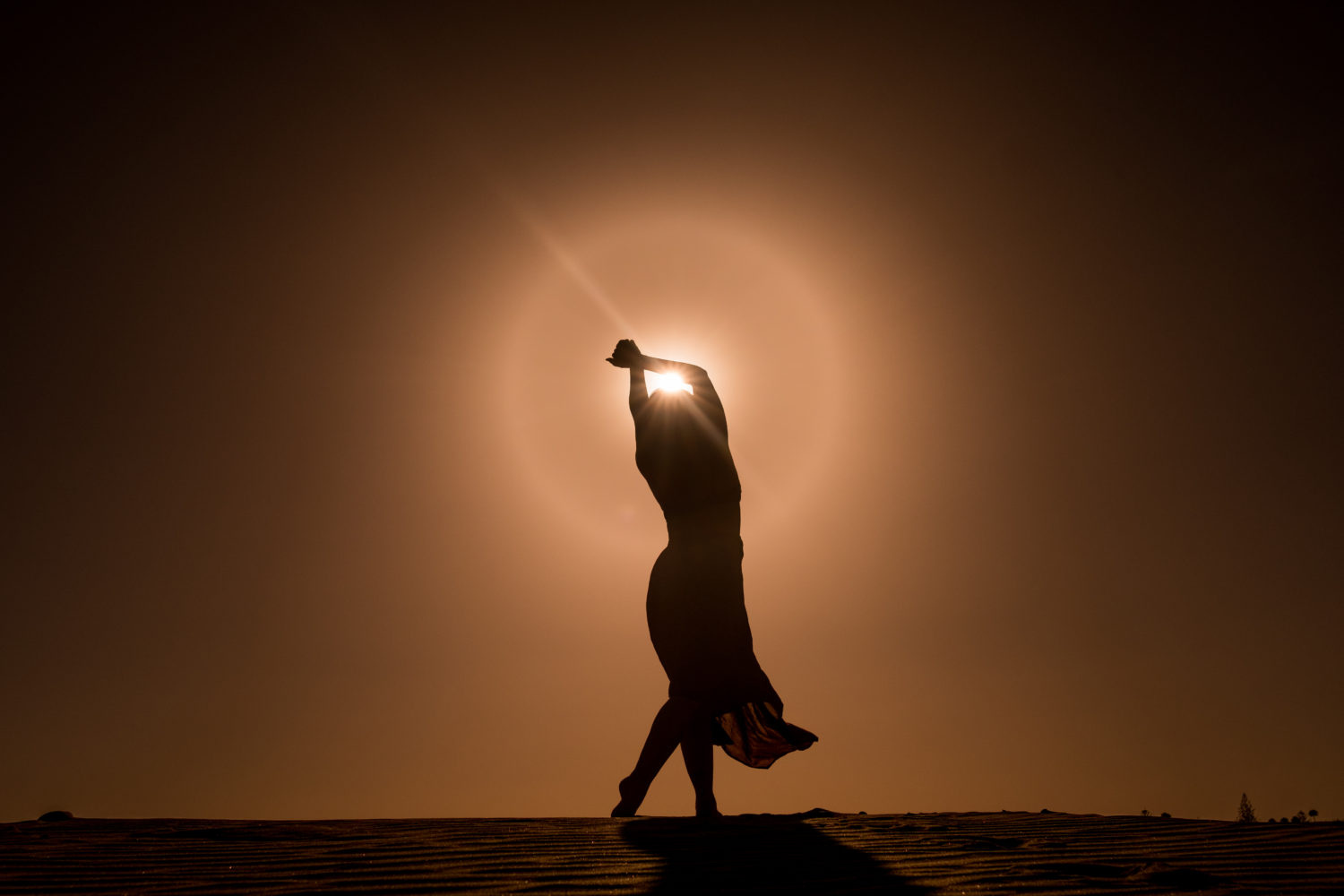 silhouette of young woman with long skirt dancing in evocative and magic way on top of desert dune at sunset with sun high in the sky