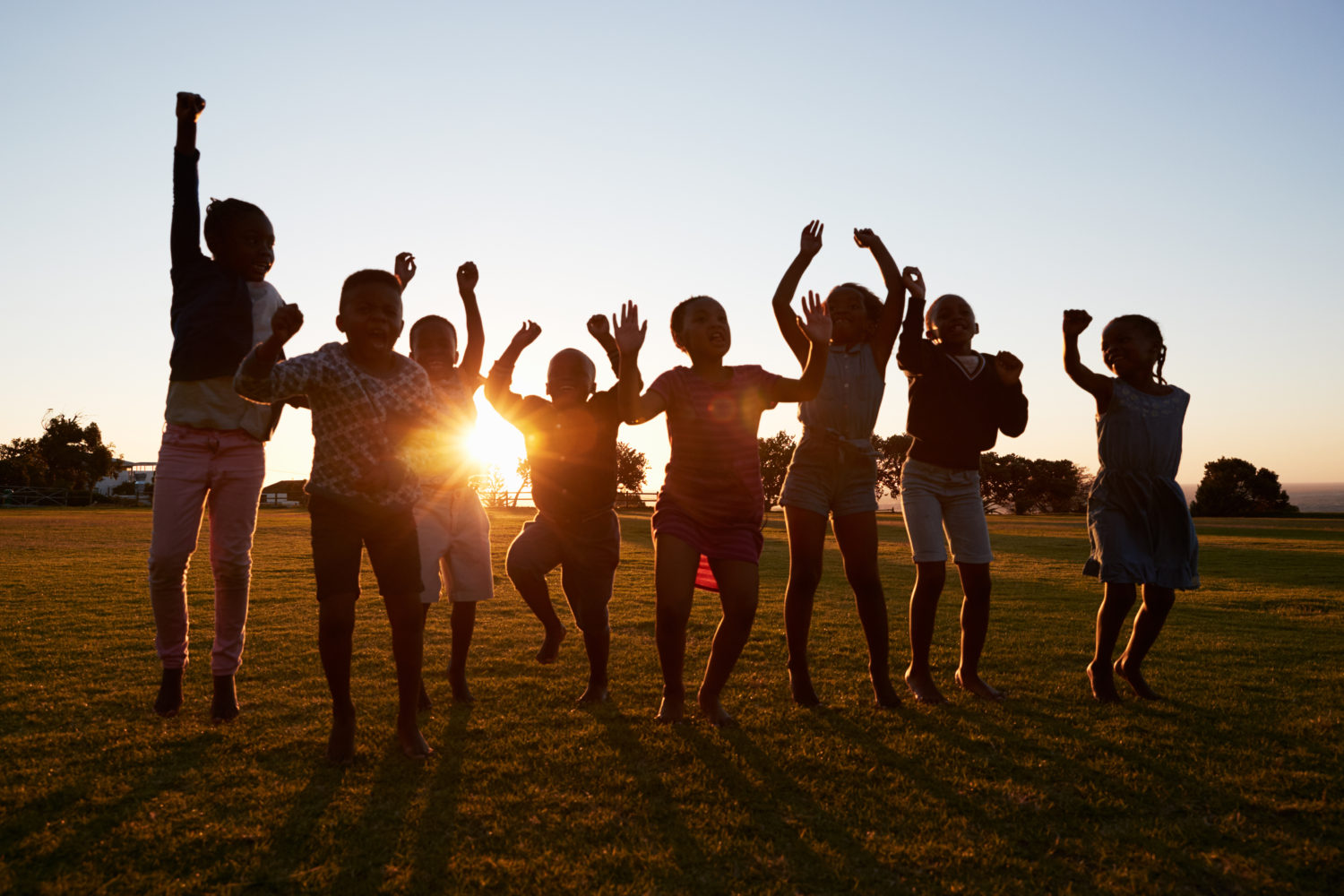 silhouetted school kids jumping outdoors at sunset ID: 35604 Silhouetted school kids jumping outdoors at sunset