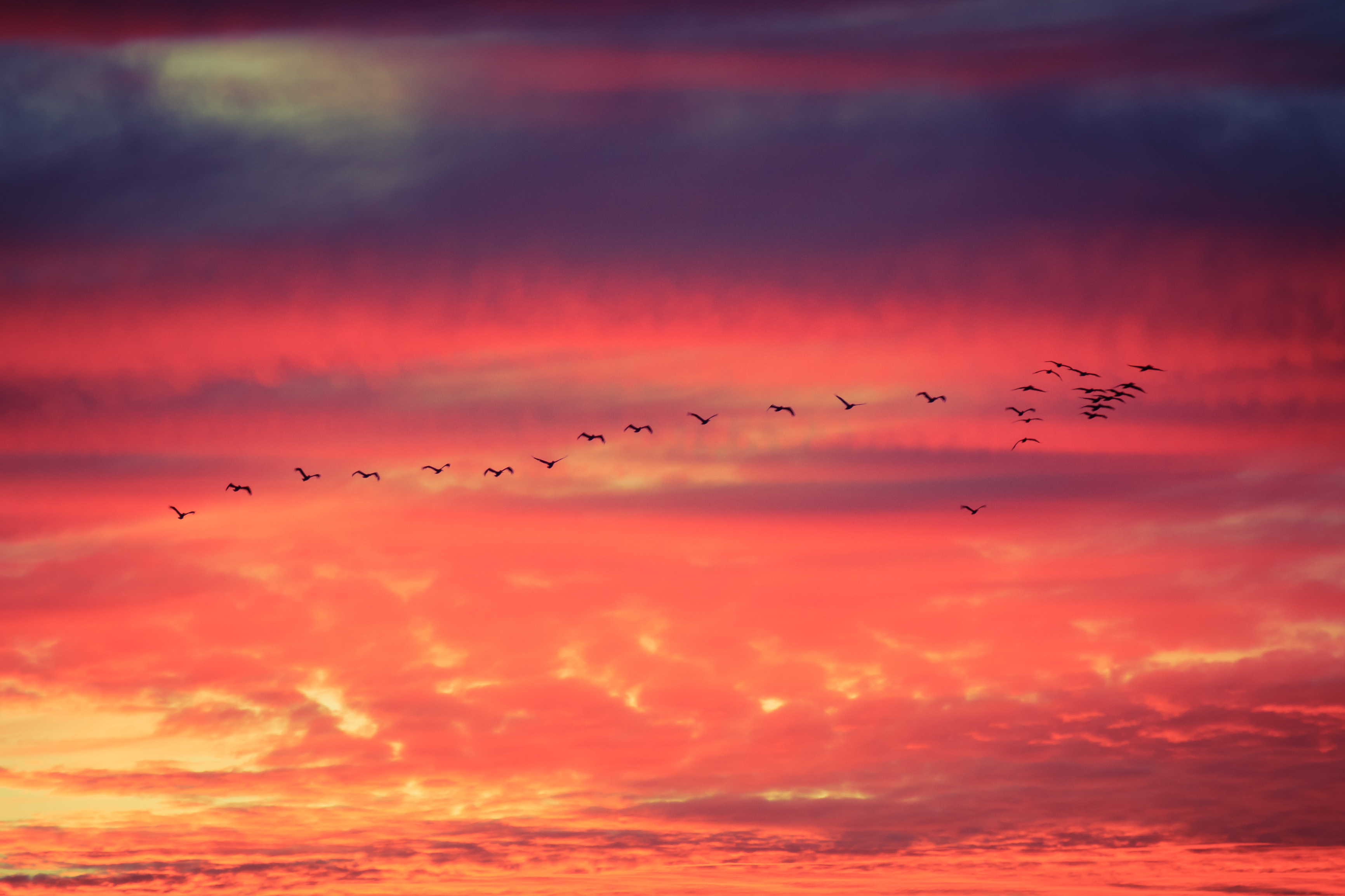 Silhoutte of birds flying in formation with dramatic clouds at sunset