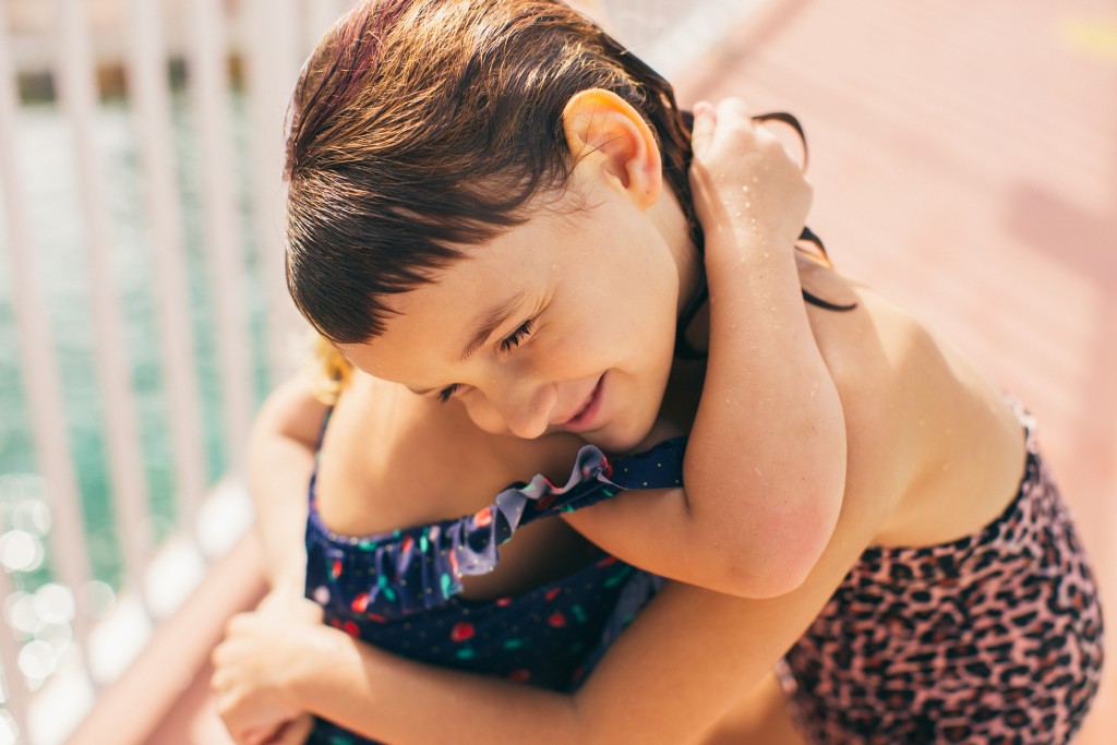 Sisters hugging beside a pool