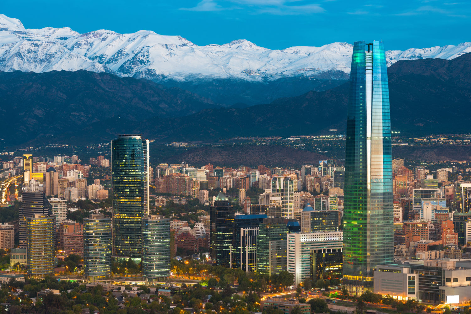 Skyline of Santiago de Chile at the foots of The Andes Mountain Range and buildings at Providencia district.
