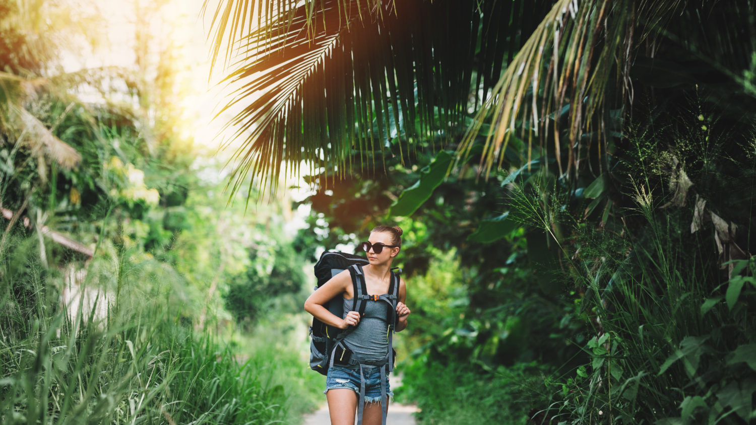 Slender young girl with a hiking backpack in the jungle. White Caucasian girl hiking in the jungle.