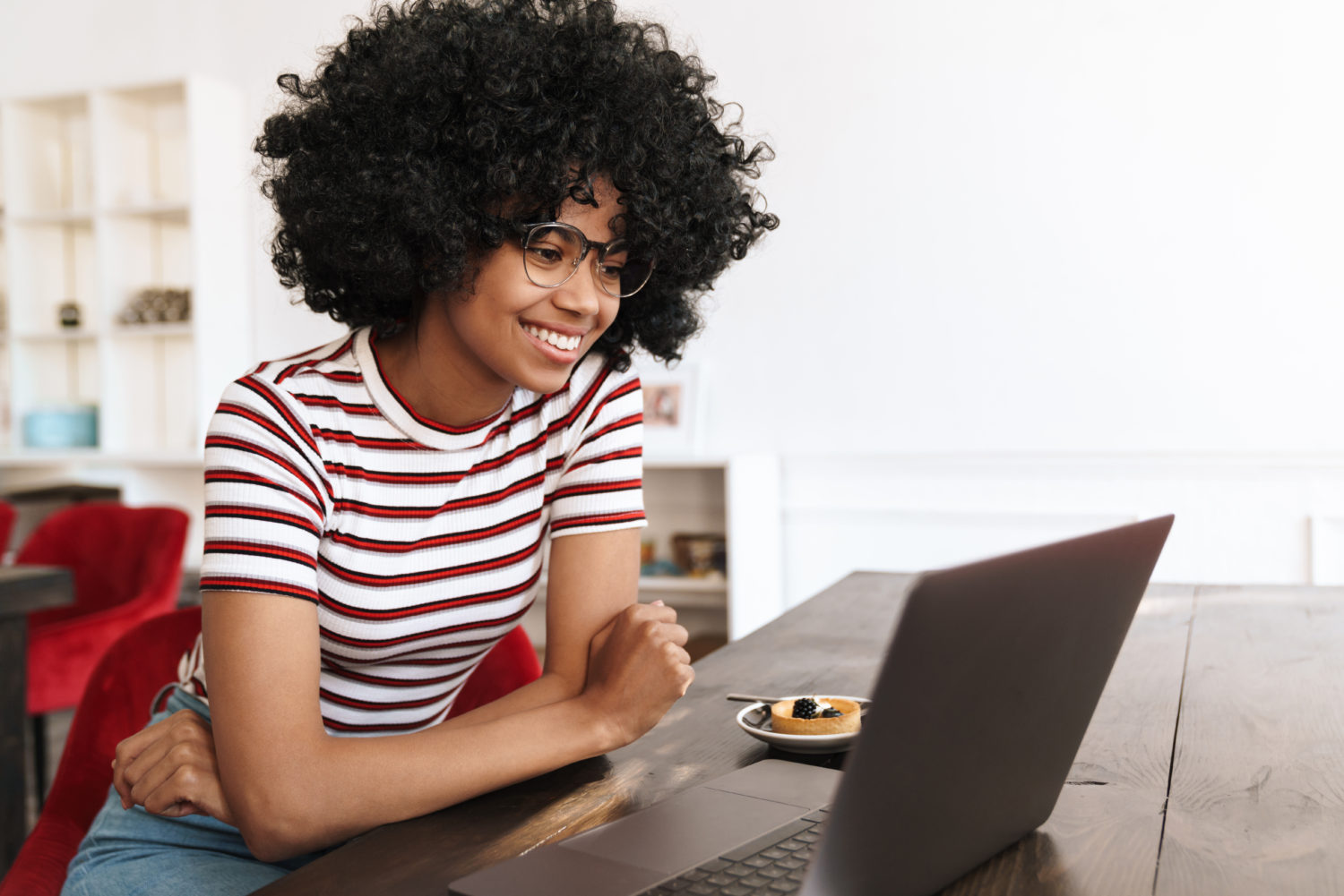 Smiling african american student girl doing homework with laptop while drinking coffee in cafe