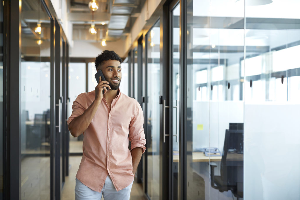 Smiling executive talking on smart phone in office