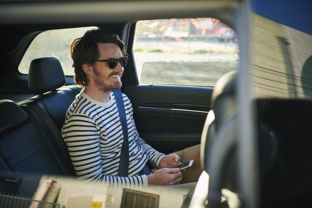 Smiling man with mobile phone sitting in backseat of car