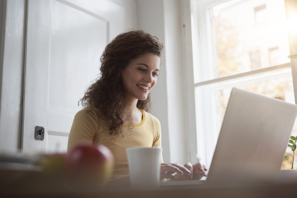 Smiling young woman at home using laptop