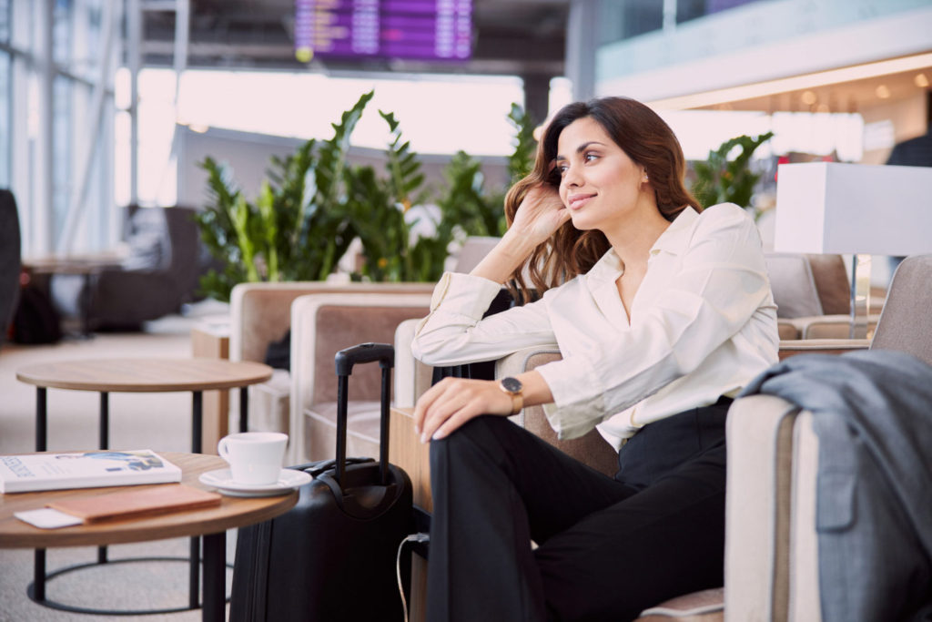 smiling young woman sitting in comfortable chair in departure lounge