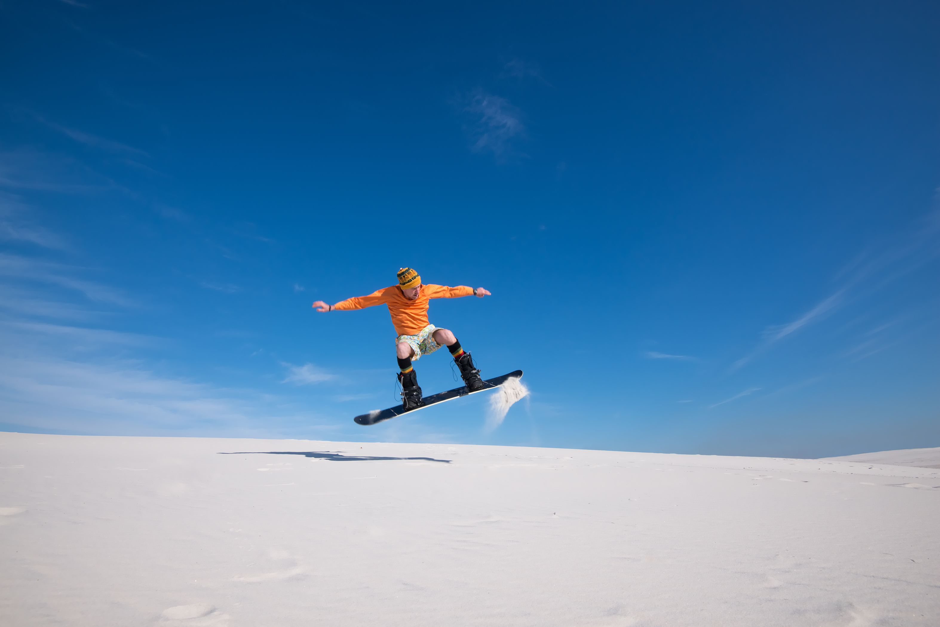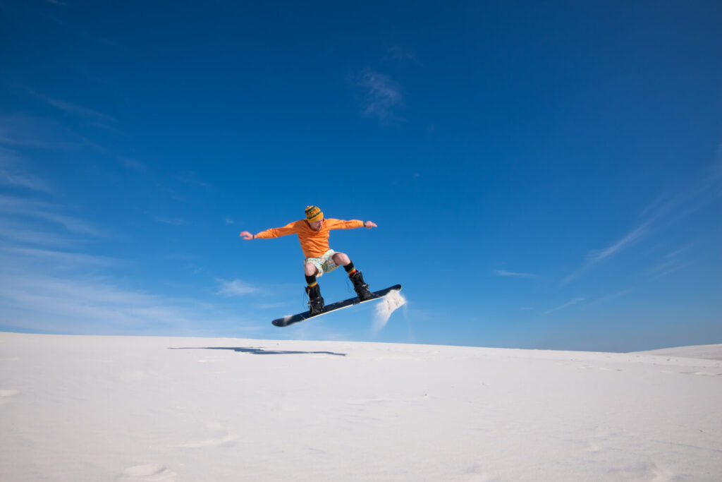 snowboarder sobrevuela la duna de arena entrenamiento de snowboard en