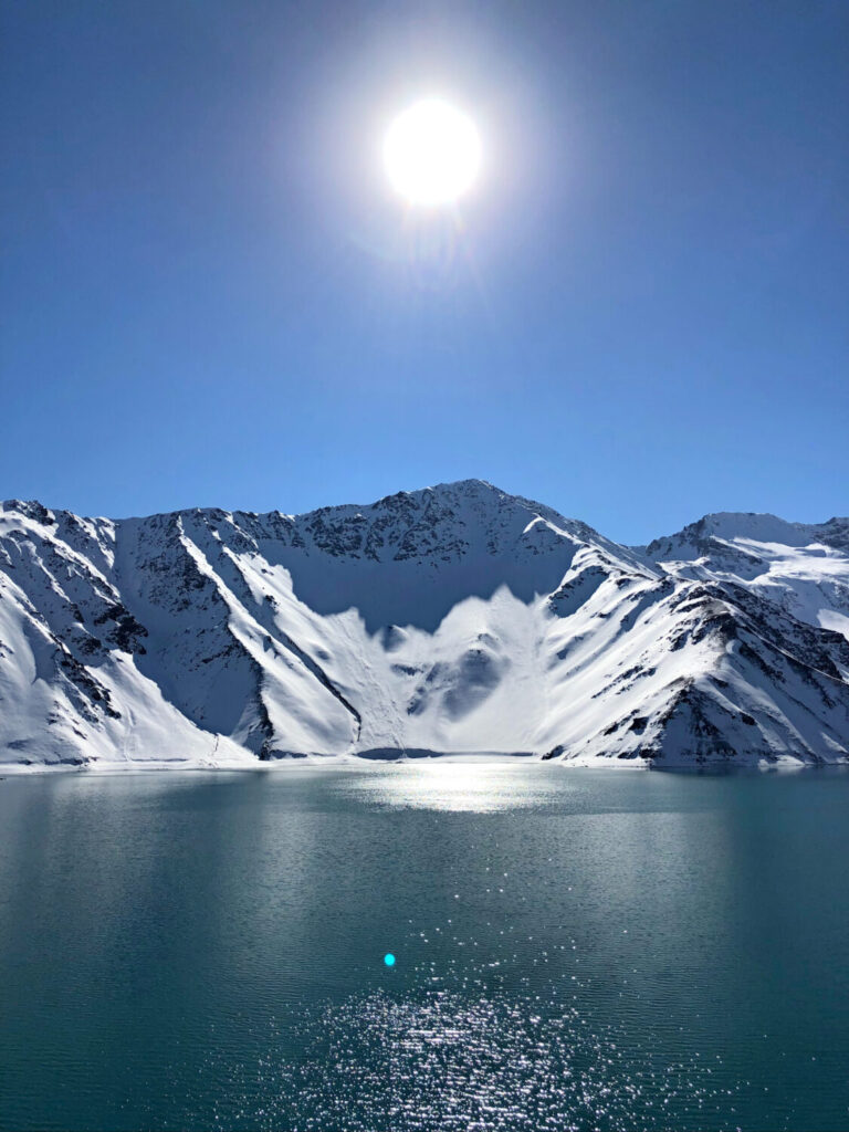 snowy mountains with sun above and large lake valle ID: 83695 snowy mountains with sun above and large lake – valle nevado Chile