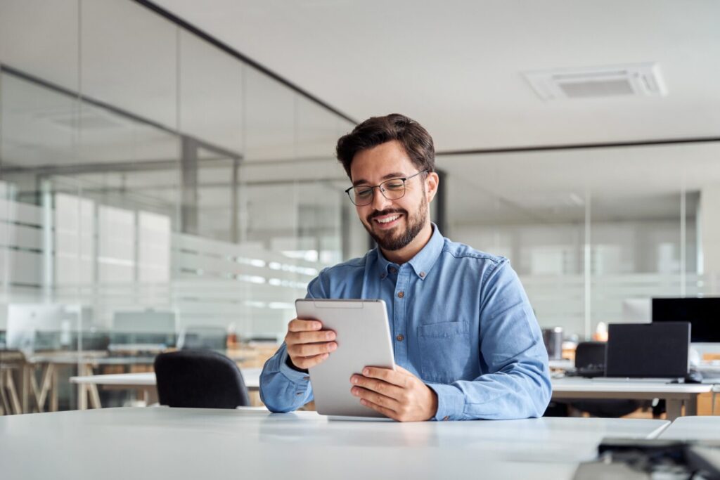 sonriente joven y ocupado gerente de negocios latino usando tablet