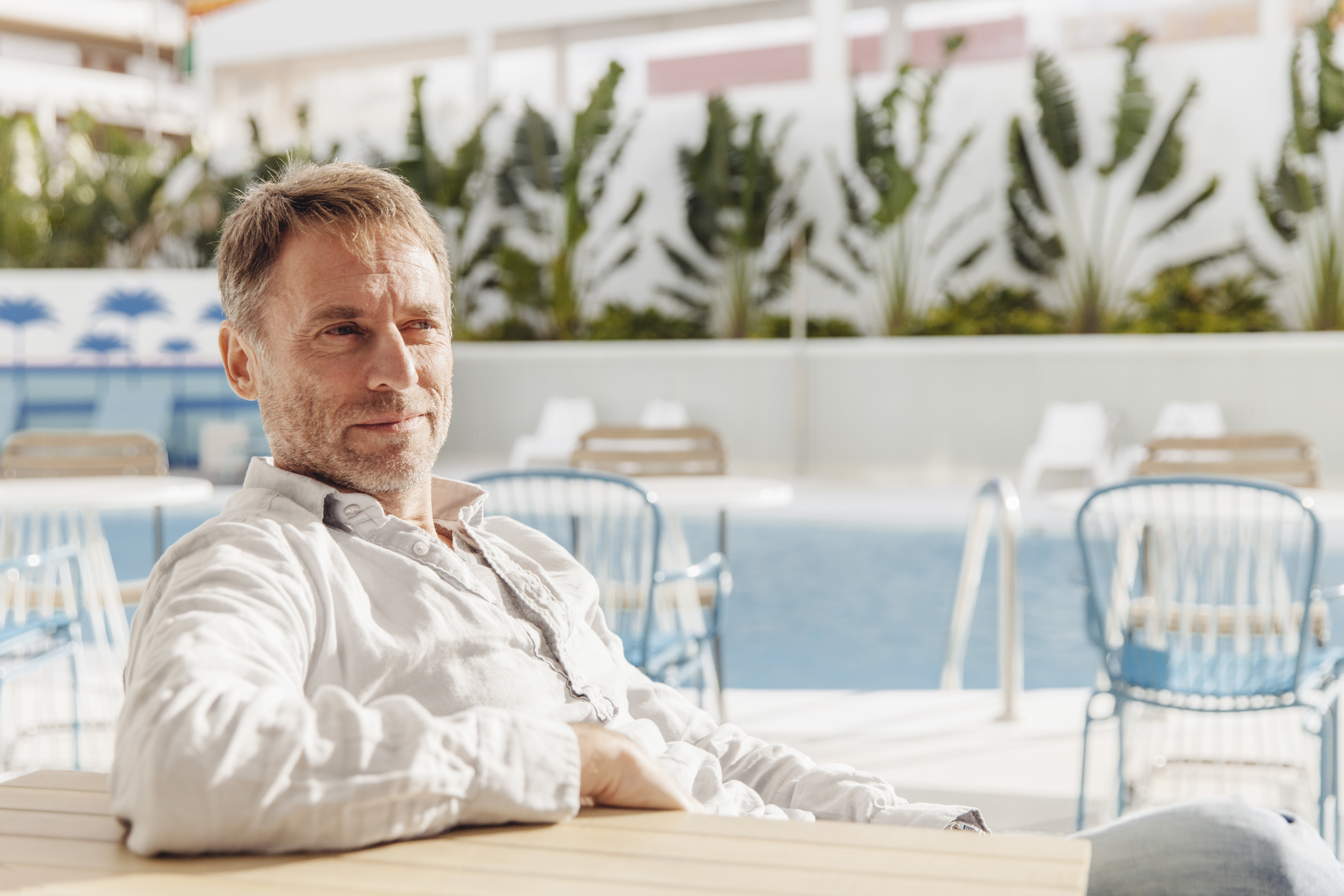 Spain, Canary Islands, Gran Canaria, mature man sitting by the pool
