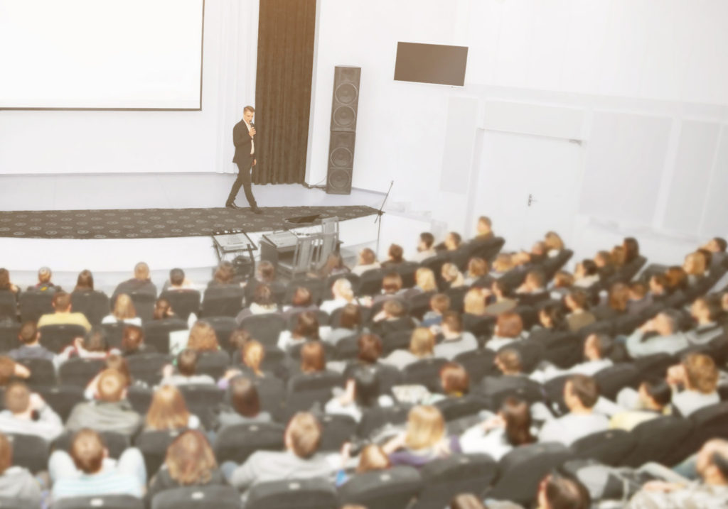 speaker at a business convention and presentations the audience on