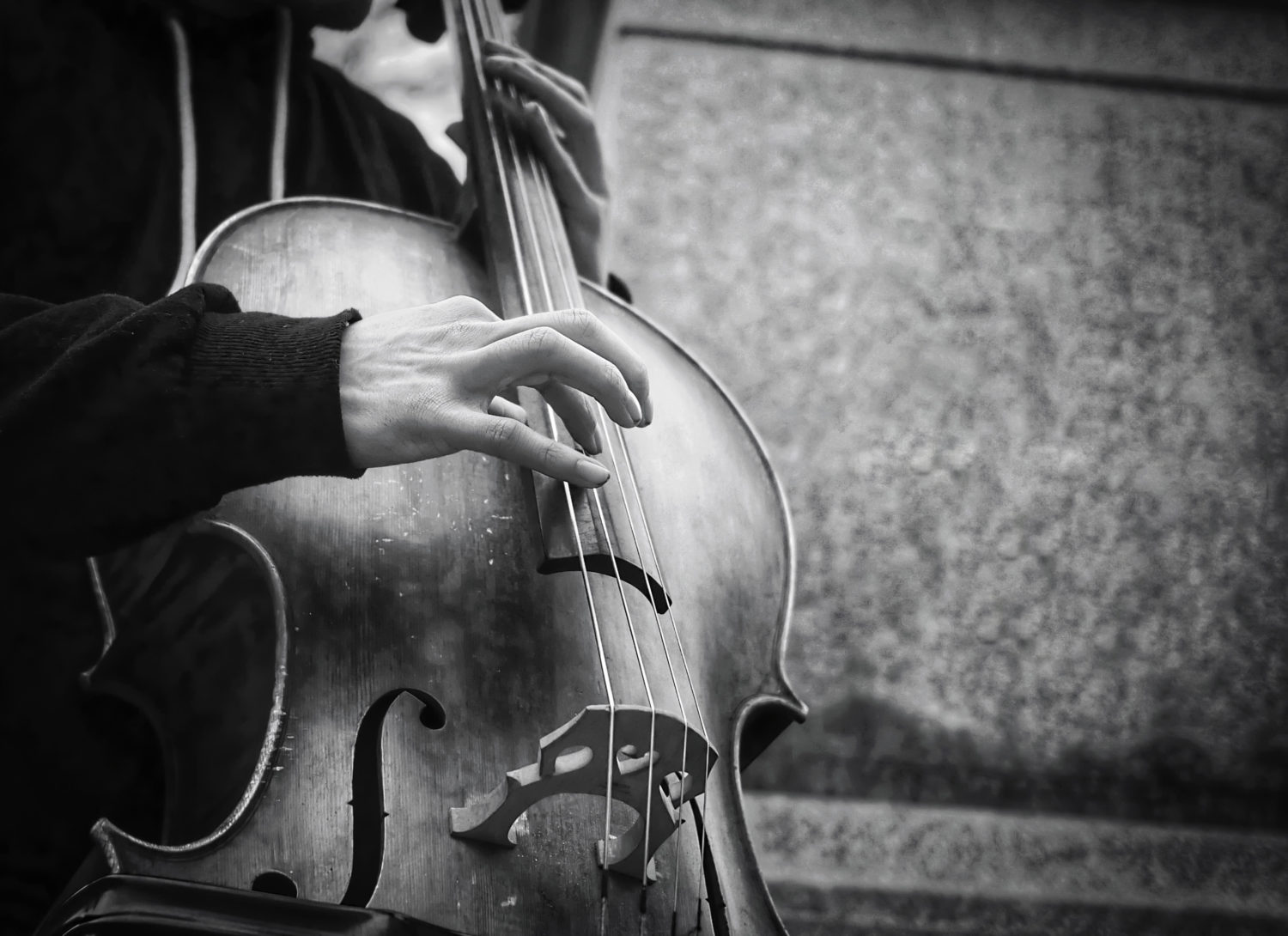street musicians hands playing bass on an acoustic instrument in