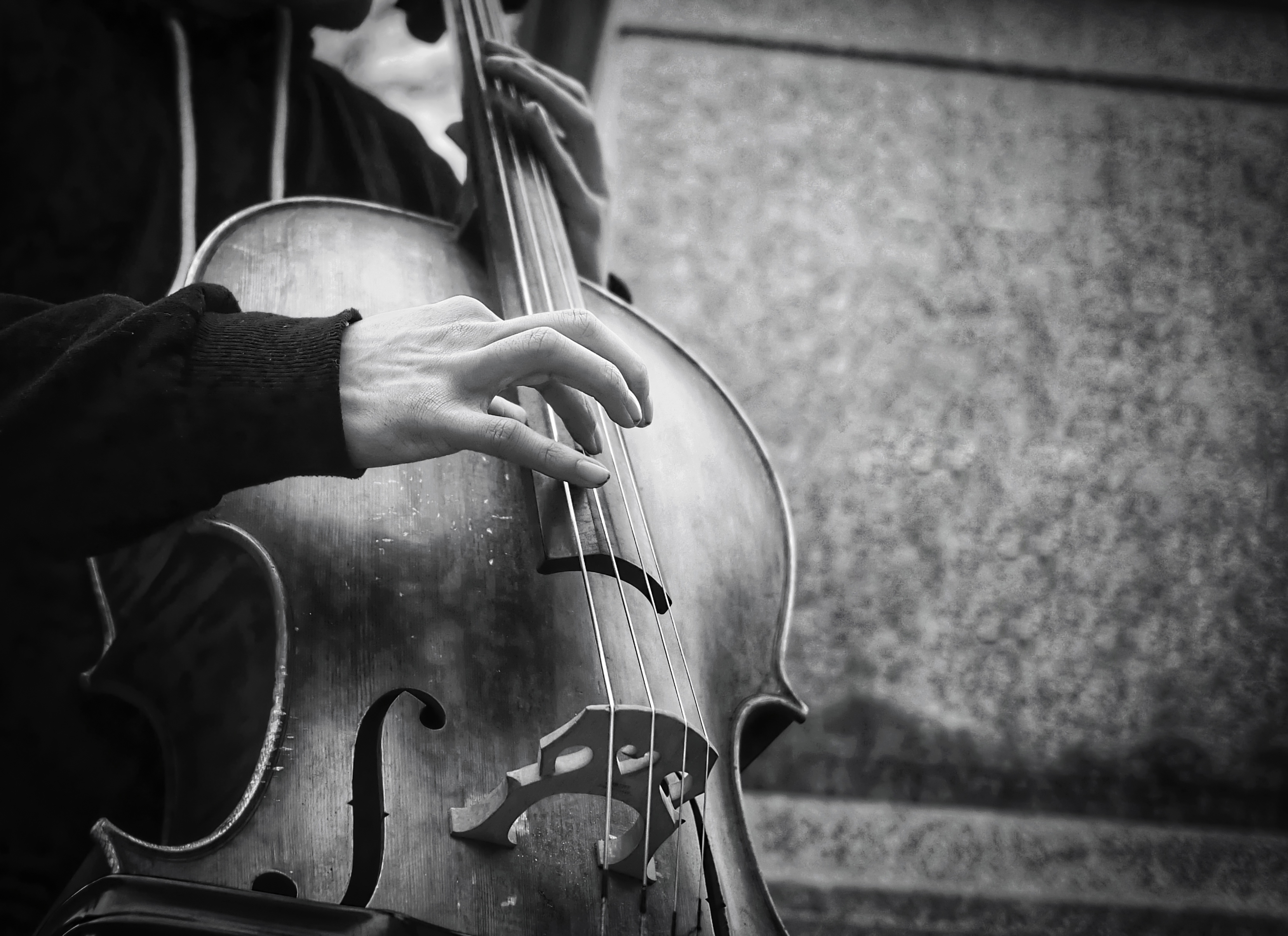 Street musician’s hands playing bass on an acoustic instrument in urban environment in winter.
