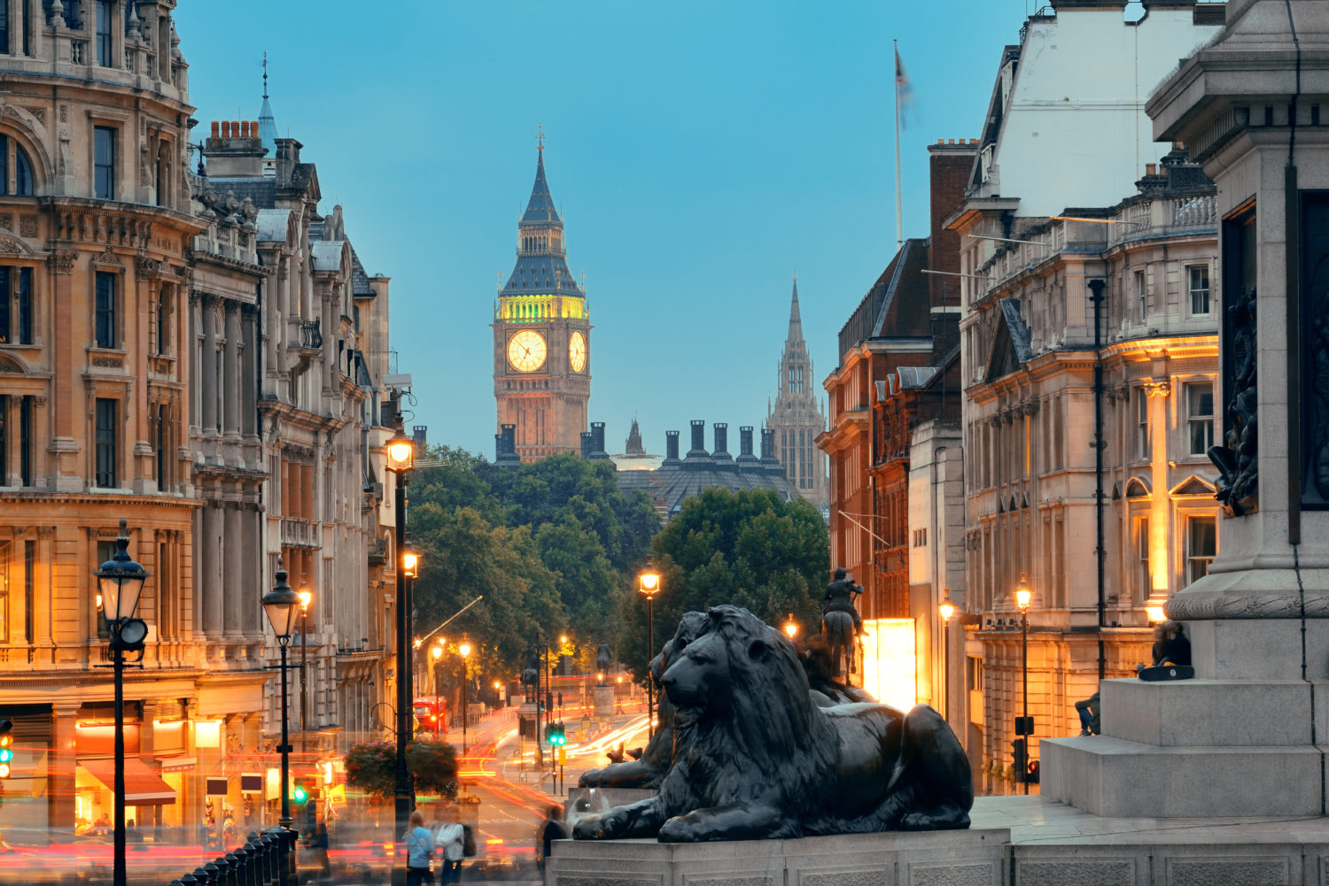 Street view of Trafalgar Square at night in London