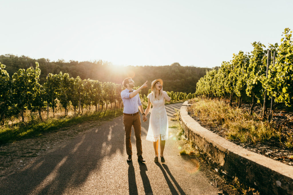 stylish couple walking among vineyard and they surprised by what