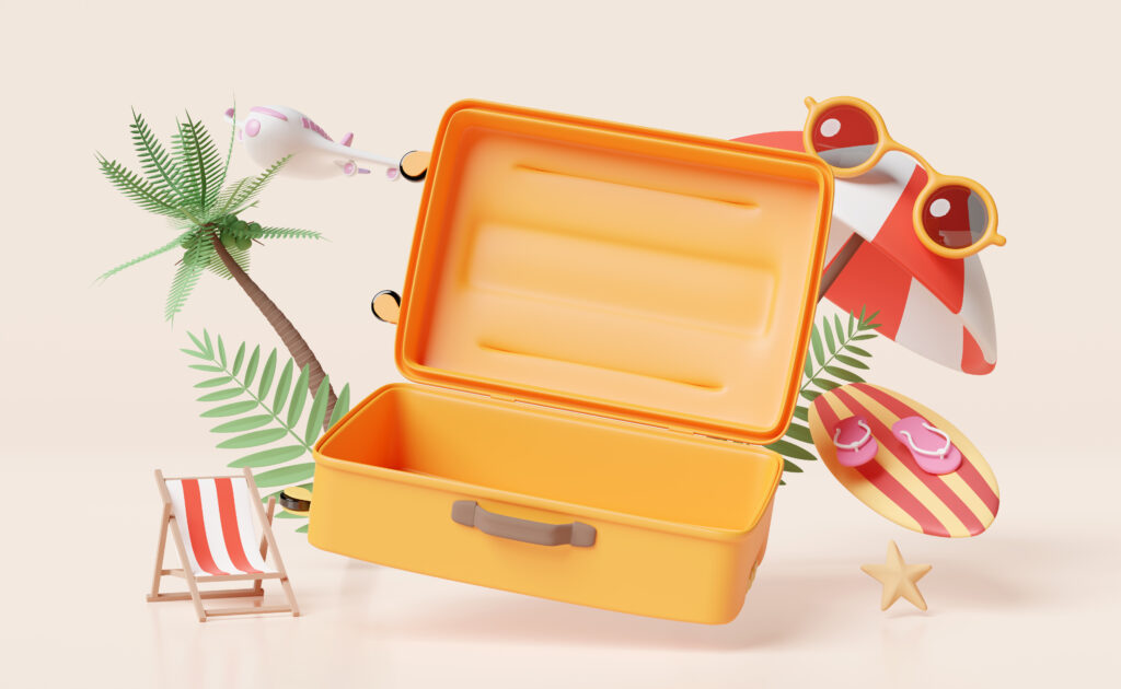 summer travel with open empty suitcase, beach chair, sunglasses, surfboard, umbrella, coconut tree isolated on orange background. concept, 3d illustration render, clipping path