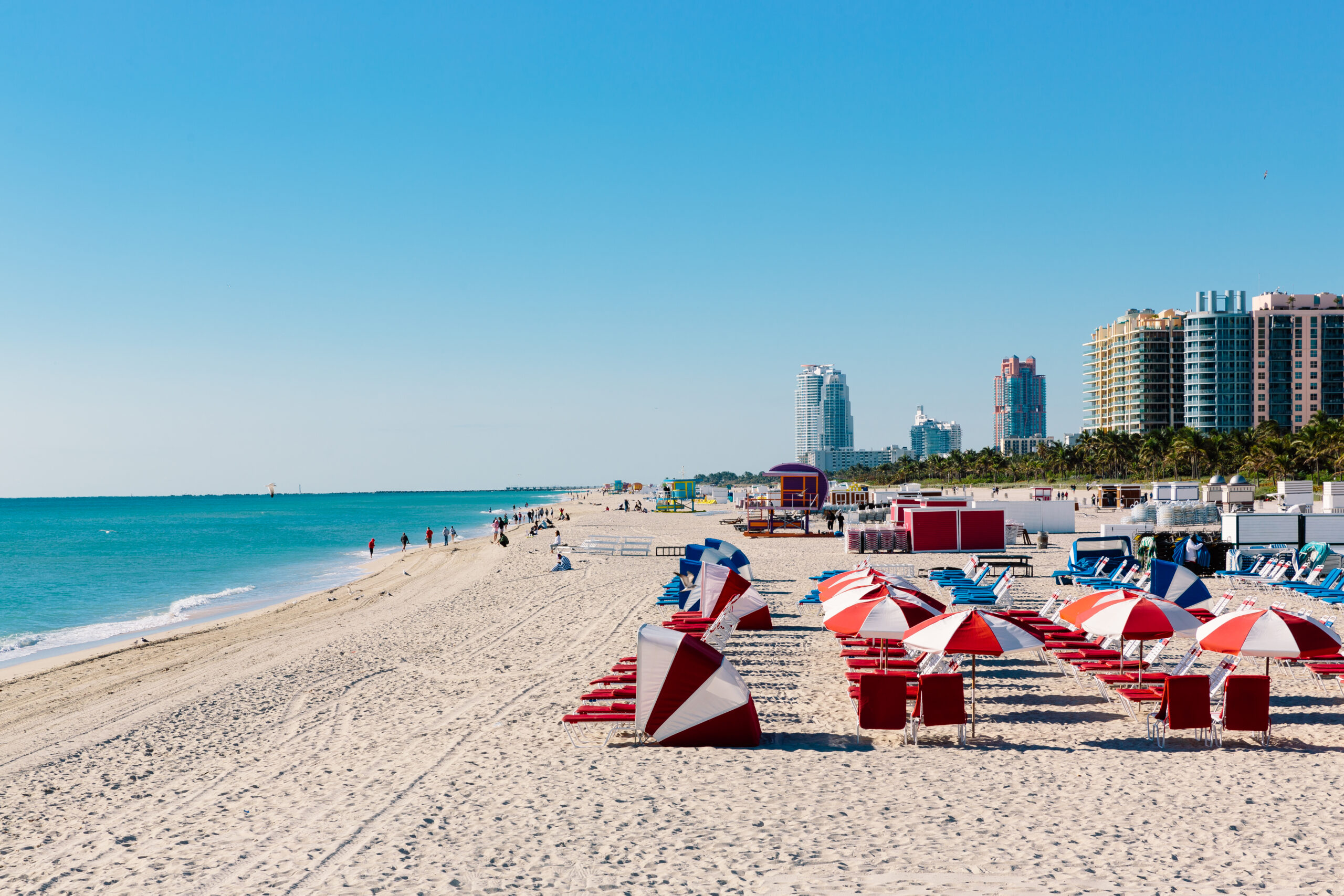 Sun beds at Miami Beach on a sunny day, Florida, USA