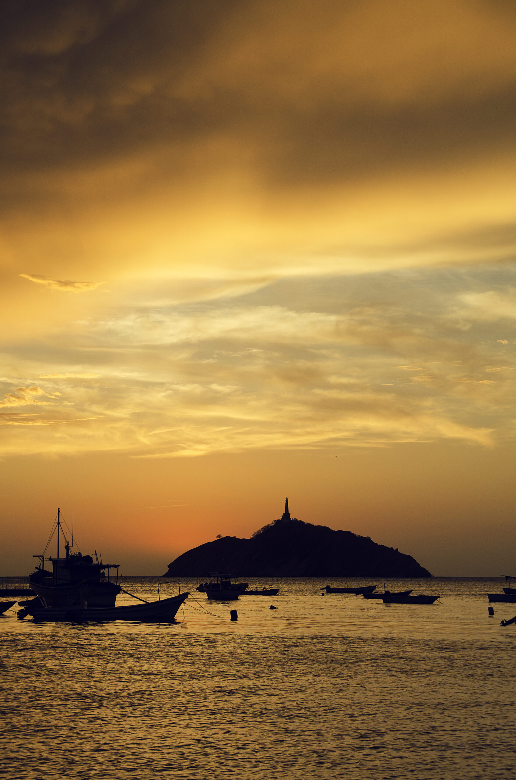 Amazing sunset in front of the sea of Santa Marta. You can see the silhouettes of boats and a small island.