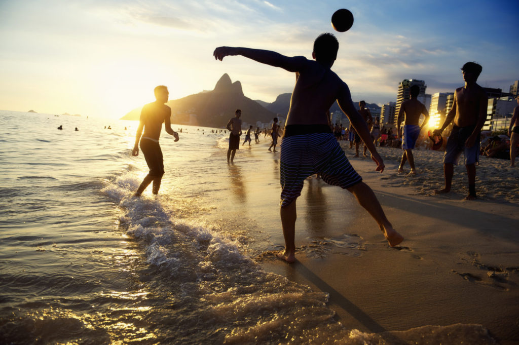 Sunset silhouettes playing altinho futebol beach football kick-ups soccer ball Ipanema Beach Rio de Janeiro Brazil