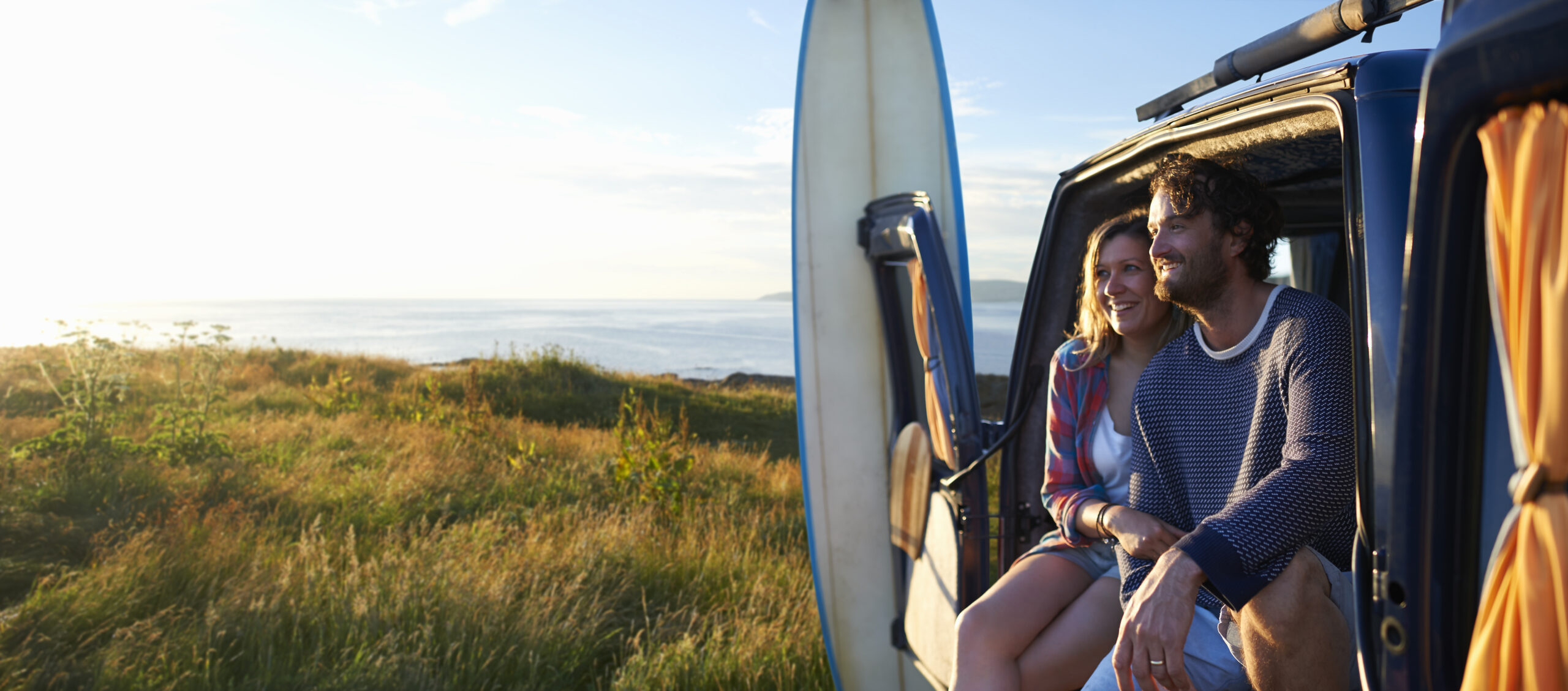 A surfing couple smile as they sit in their camper van and embrace on an idyllic summer Atlantic coastline.