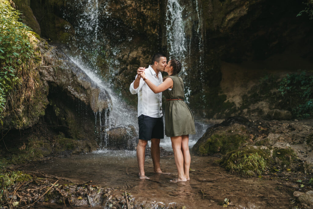 Sweet summer love ID: 76698 Beautiful young loving couple holding hands and kissing in front of waterfall on sunny day