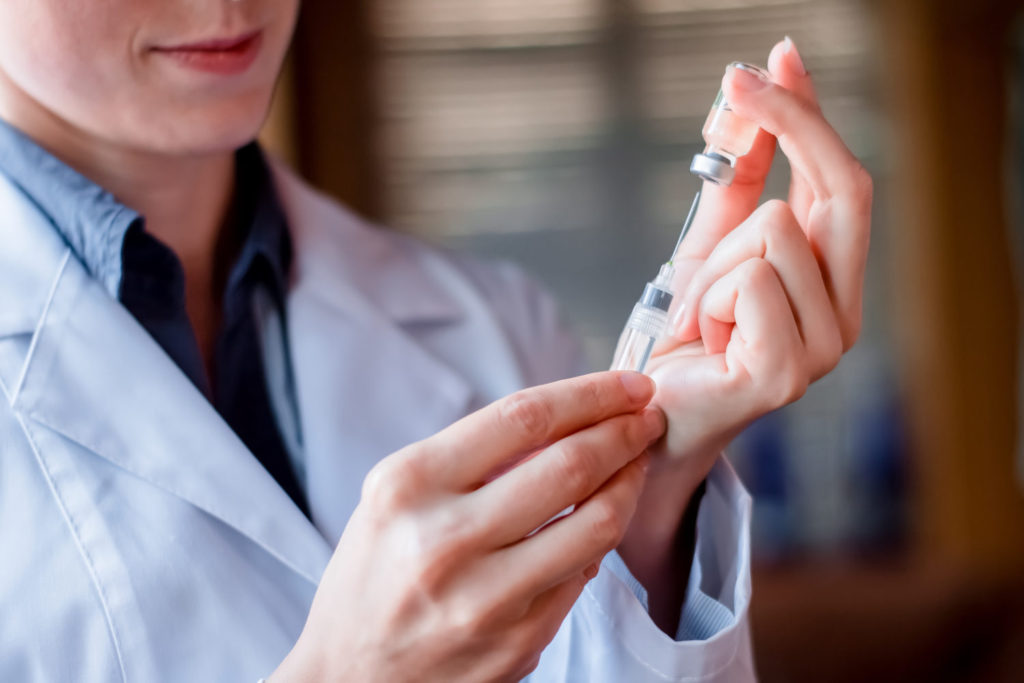 Syringe, medical injection in hand, palm or fingers. Medicine plastic vaccination equipment with needle. Nurse or doctor. Liquid drug or narcotic. Health care in hospital.