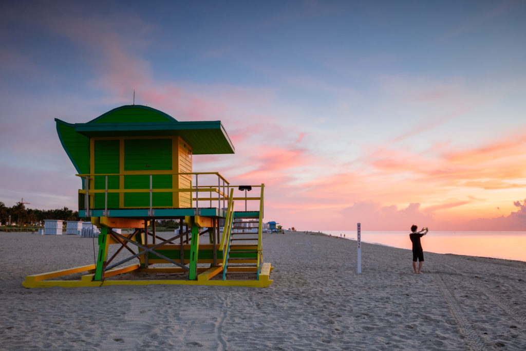 Teenager near lifeguard cabin at sunrise, Miami beach, USA ID: 69901 Young adult looking at view on Miami South beach, Miami, Florida, United States