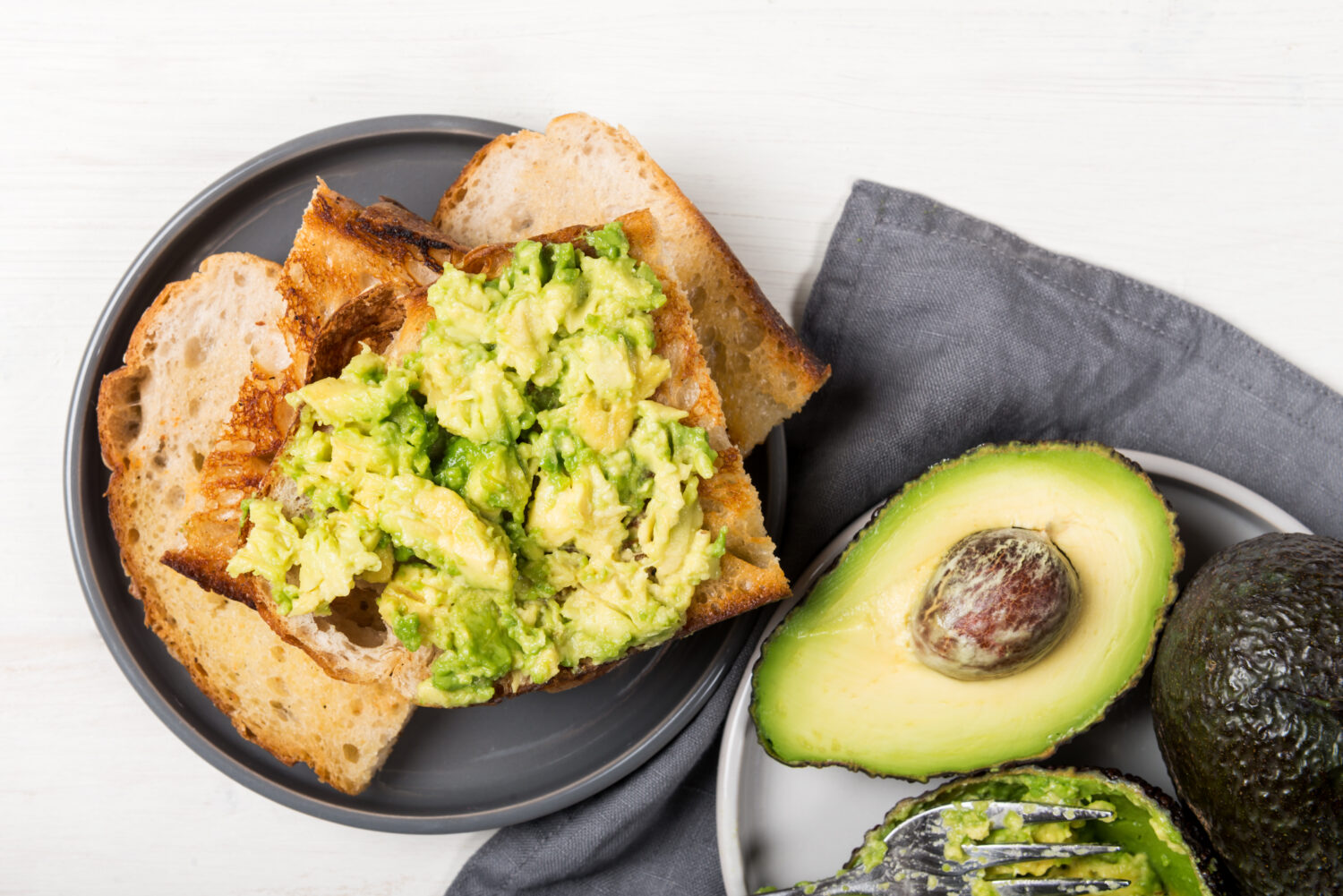 Tentempiés saludables de tostadas de aguacate a partir de pan de pasta base sobre fondo de madera clara