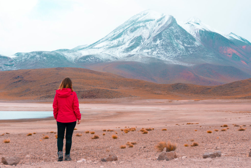 the altiplano of the Antofagasta Region, in northern Chile. Woman walking outdoors with lake and volcano and mountain view in the background. Miñiques volcano. Lagunas Miscanti y miniques.