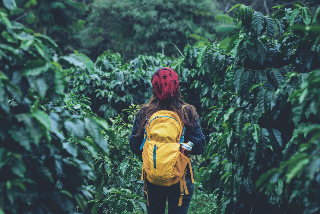 The girl with backpack is standing and walking in the coffee garden.Travel relax