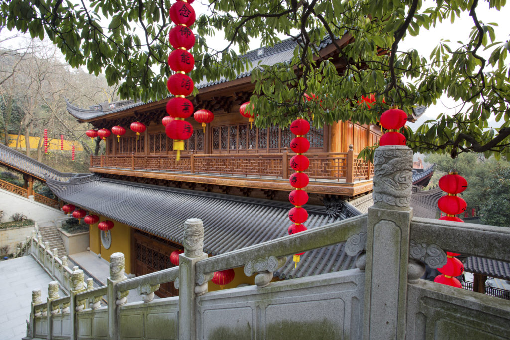 The red lanterns hanging on trees in Faxi Temple, Hangzhou, China