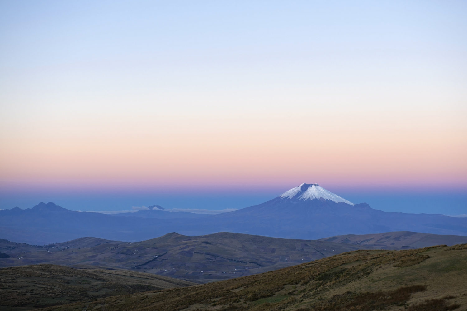 The snowcapped Cotopaxi Volcano at sunset, Andes Mountains, Quito, Ecuador.
