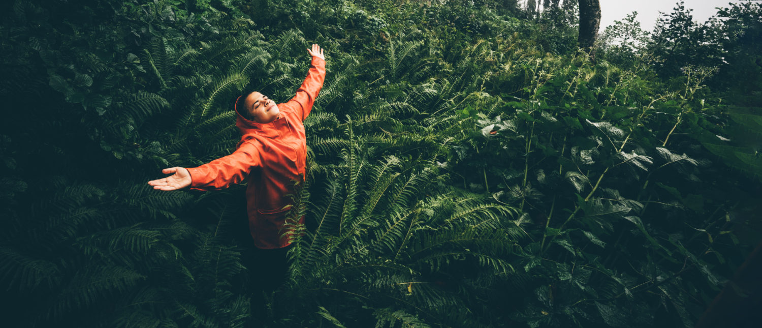 The young woman with orange raincoat smiles and laughs under the rain. Girl enjoying warm summer rain at the tropical forest. Сoncept of nature and happy life with adventure.